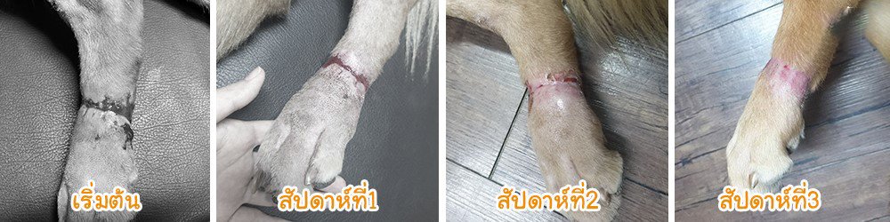 4. มีแผลตื้น หรือ แผลลึก เร่งกระบวนการหายของแผล เหมือนกับน้องขนุนที่มีเเผลโดนบาดลึกรอบข้อเท้า จนทำให้ไม่ลงน้ำหนักขาเลย