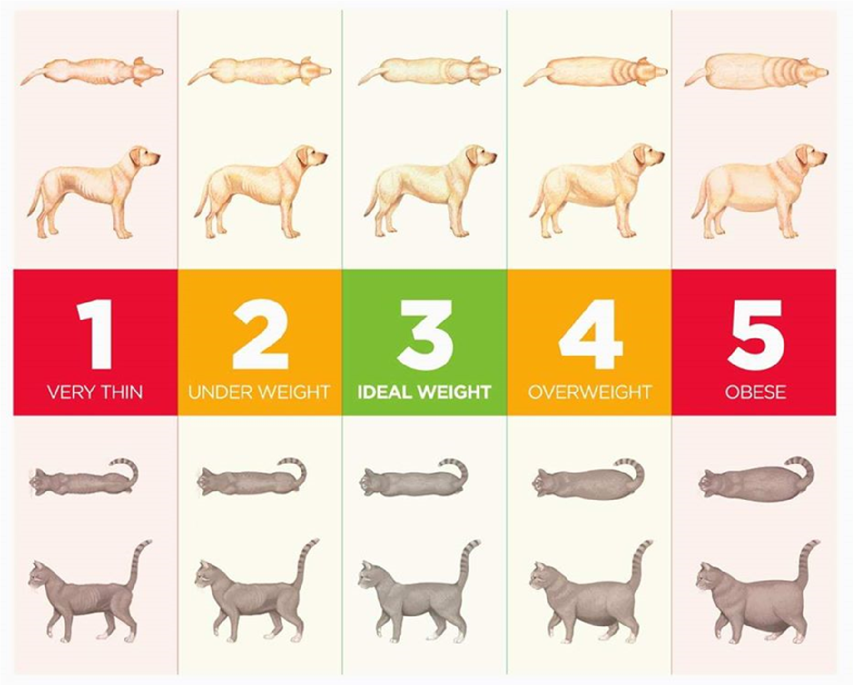 การประเมินคะแนนความสมบูรณ์ของร่างกาย (Body condition score) ทำได้ง่ายโดยการสังเกตุและคลำโครงสร้างบนร่างกายของสัตว์เลี้ยง โดยทางสัตวแพทย์จะมีวิธีการแบ่งเป็น 2 หลักเกณฑ์คือ 5 ระดับ  และ 9 ระดับ.......เพื่อเป็นการง่ายแก่เจ้าของ วันนี้หมอจะมาแนะนำหลักเกณฑ์แบบ 5 ระดับ ซึ่งสามารถใช้เกณฑ์เดียวกันนี้กับน้องแมวด้วยค่ะ