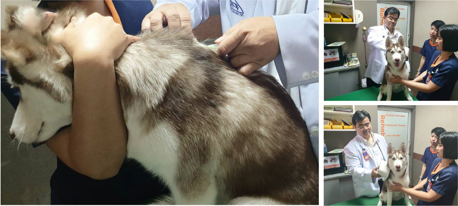 4. ทำการฝังไมโครชิพโดยใช้เข็มทำการฉีดเข้าไปที่ชั้นใต้ผิวหนัง บริเวณระหว่างหัวไหล่ทั้ง 2 ข้าง