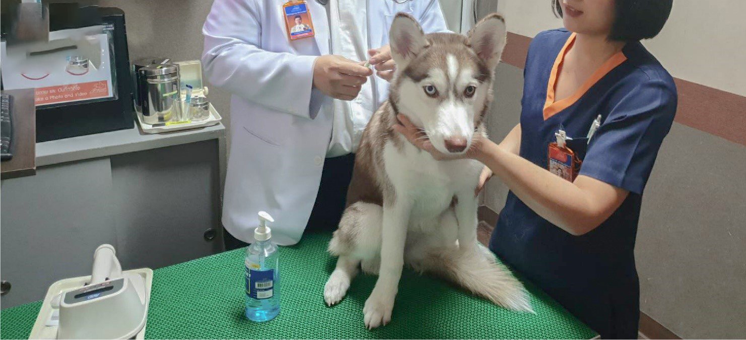 2. คุณหมอจะนำเครื่องอ่านรหัสไมโครชิพ สแกนเข็มที่บรรจุไมโครชิพเพื่อตรวจให้เเน่ใจว่าในเข็มได้บรรจุไมโครชิพไว้และตรวจสอบรหัสของไมโครชิพว่าตรงกับที่ระบุไว้บนซองบรรจุหรือไม่