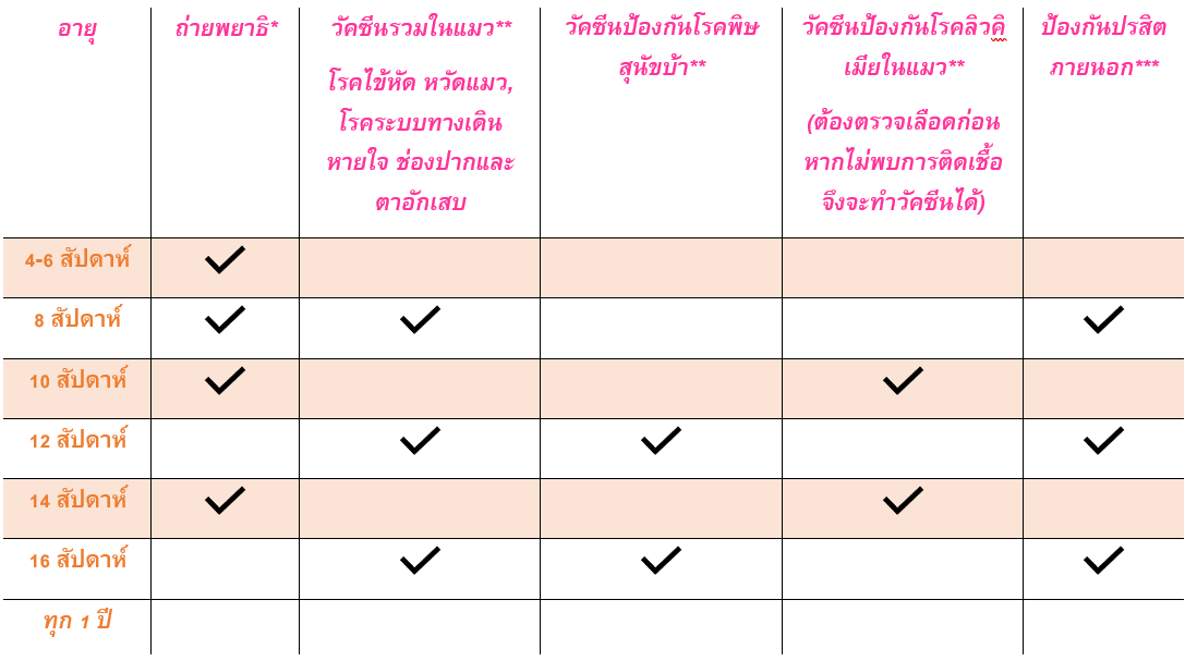 *แมวอายุน้อยกว่า 3 เดือน ควรถ่ายพยาธิทุก 2 สัปดาห์ และแมวอายุ 3 เดือน ขึ้นไป ควรถ่ายพยาธิทุก 3 เดือน