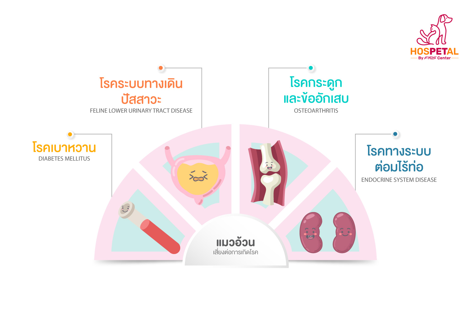 แม้ว่าการที่แมวอ้วนจะน่ารักขนาดไหนก็ตาม แต่หากมีน้ำหนักมากเกินไปจะทำให้เกิดปัญหาอื่นๆ ตามมาได้โดยเฉพาะแมวที่กินเก่งส่งผลให้เกิดโรคได้ เช่น