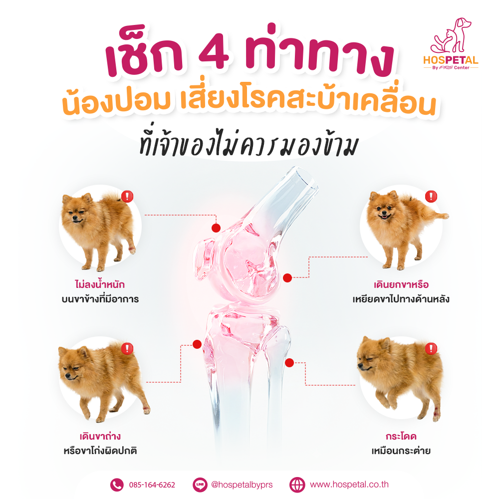 หากเจ้าของสังเกตเห็นว่าน้องปอมมีอาการเดินกะเผลก ยกขาหลัง กระโดดเหมือนกระต่าย หรือไม่ลงน้ำหนักบนขาข้างใดข้างหนึ่ง อย่ามองว่าเป็นเรื่องเล็กน้อย เพราะอาจเป็นสัญญาณของ โรคสะบ้าเคลื่อนในสุนัข